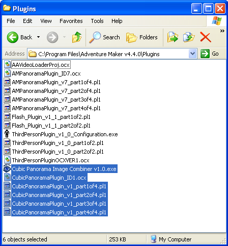 If you are using Adventure Maker v4.5.2 or older: Click here to download the Cubic Panorama Plugin v1.0 package (90KB) Be sure to read the Readme file that is included in the plugin package for installation instructions. License The Cubic Panorama Plugin is free of charge for: - non-commercial use - commercial use up to 100 copies of each game sold that uses the plugin As soon as you start selling more than 100 copies of a game that uses the plugin, a very small royalty on the sold copies that exceed 100 is required. This allows compensating for the investments related to the development of the plugin. Please read this page for details concerning the license. Features The Cubic Panorama Plugin supports interactivity: you can place hotspots to link the scenes to one another, to play sounds, to display messages, to change variables, and to do most of the other common actions of Adventure Maker. You can easily create puzzles without programming by making the hotspots and images appear and disappear according to the value of the variables (to do so, just use the options that are under the "Variables" tab of the Hotspot Properties, and also check the "Update the cubic panorama to reflect the hotspots changes" option that is under the "Plugins" tab of the Hotspot Properties). You can display full-screen transitions between frames. You can move back and forth between panoramic and non-panoramic frames (to use the inventory items for example). You can animate the panoramas by embedding looping videos (to do so, create a hotspot, and choose "looping video" under the "Appearance" section of the Hotspot Properties). You can make such videos appear and disappear according to the values of the variables. Notes: For best results, be sure to use this plugin with Adventure Maker v4.5 or newer (older versions of Adventure Maker may work fine, but some features may be missing). Be sure to read the limitations and other important notes of the Readme file that is included in the plugin package. In particular, with v1.0 of the plugin, it is recommended that you use only images up to 2048x1365. Using bigger images is possible, but the produced games may not be compatible with some old video cards. Getting started To try out the Cubic Panorama Plugin right away, follow these simple steps: 1) Download the file "Cubic_Panorama_Plugin_v1_0.zip" from the "Download" section above, and extract it into a folder of your hard disk. It contains the plugin files. 2) You will obviously need at least one cubic panorama picture to use the plugin. You can download a sample full-resolution picture here. This is what it looks like:  TIP: To create your own panoramic pictures, you can use just any 3D rendering program. Just render 6 square-sized images (four sides plus a top and bottom) with a camera FOV of 112.5 or 90 (depending on the software you use). You can find a very nice tutorial for Bryce here. Instructions for POV-RAY, Blender, Vue, and Terragen can be found here. Once you have rendered the 6 pictures, you can merge them into a single picture by using the "Cubic Panorama Image Combiner" tool that is included in the plugin package:  3) Copy the plugin files into the "Plugins" sub-folder of Adventure Maker: 4) Activate the plugin from the "Plugins" tab of the Project Properties:  5) Create a new frame by using the panoramic picture mentioned at step2, and apply the plugin by going to the "Plugins" tab of the Frame Properties:  6) Test the frame, and you should see yourself immersed in a full 360-degree panoramic scene! Feedback and support Please contact us for feedback and support. | |